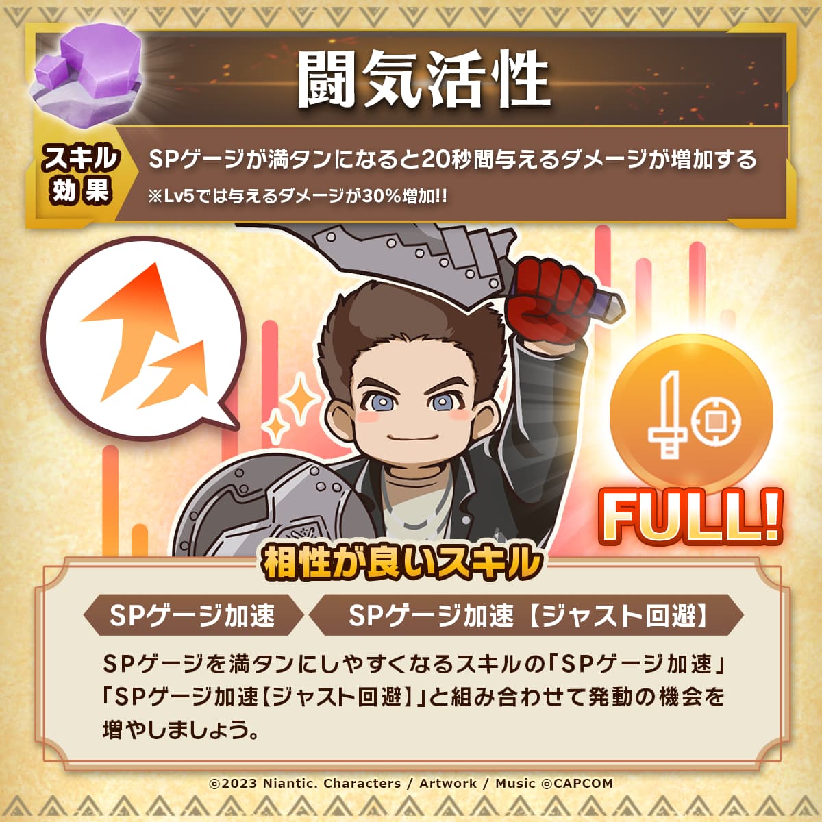 SPゲージが満タンになるとダメージが増加するスキル。SPゲージを満タンにしやすくなるスキル「SPゲージ加速」「SPゲージ加速【ジャスト回避】」と組み合わせて発動の機会を増やしましょう。Lv5では与えるダメージが30%増加!