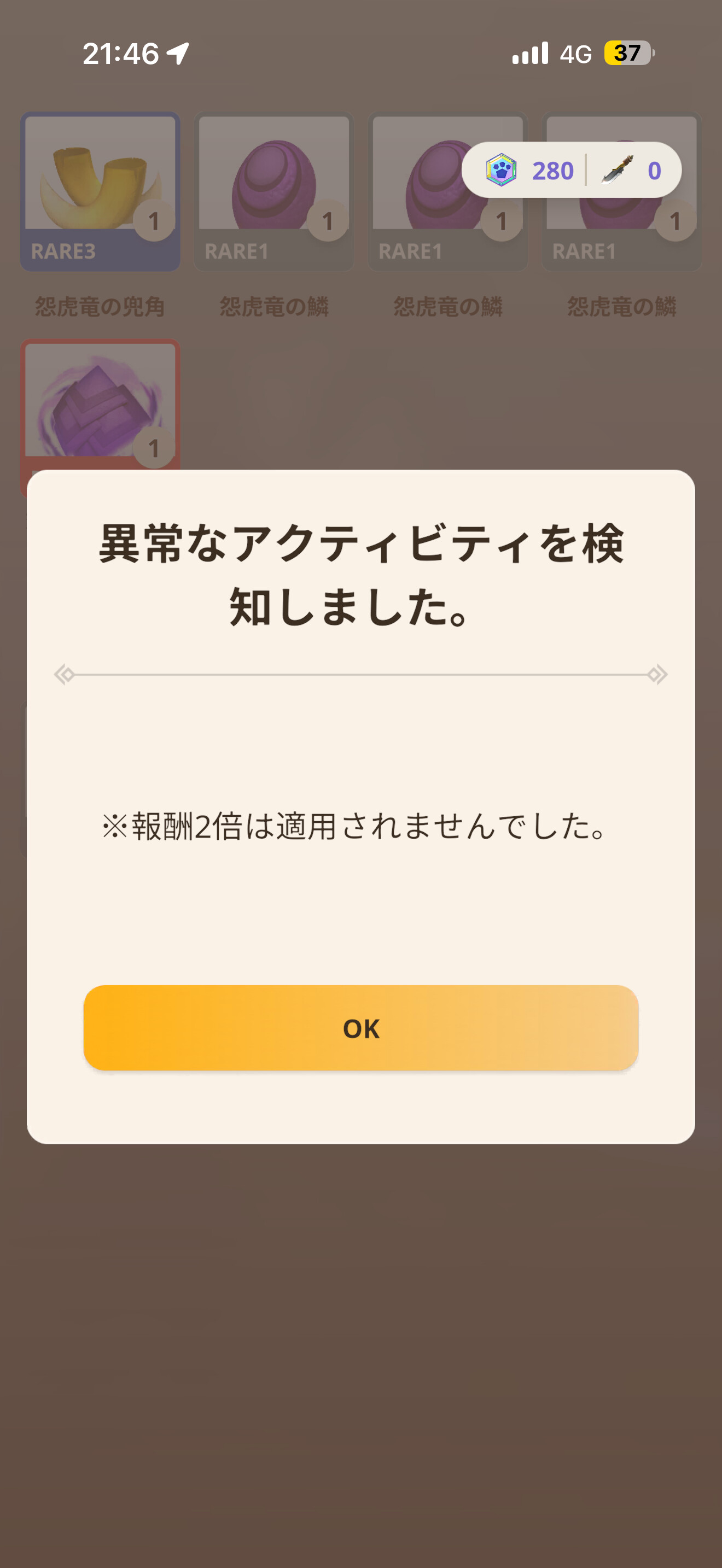 しばらくしてエラーを表示「異常なアクティビティを検知しました。※報酬2倍は適用されませんでした。」
